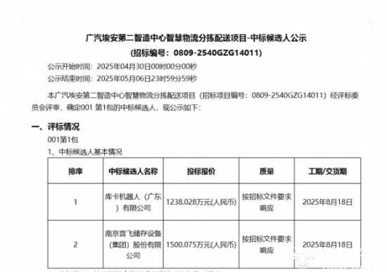 房产、广汽埃安于2025年3月28日正式发布招标公告。要求中标方在2025年8月18日前完成智能立体库设备交付。